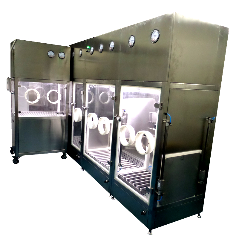 ·整體封閉式隔離艙結構(RABS)設計,設備安裝在10000級(B級)區,分為進料桶\袋緩沖區、自動振蕩稱重分裝區、自動封蓋區、